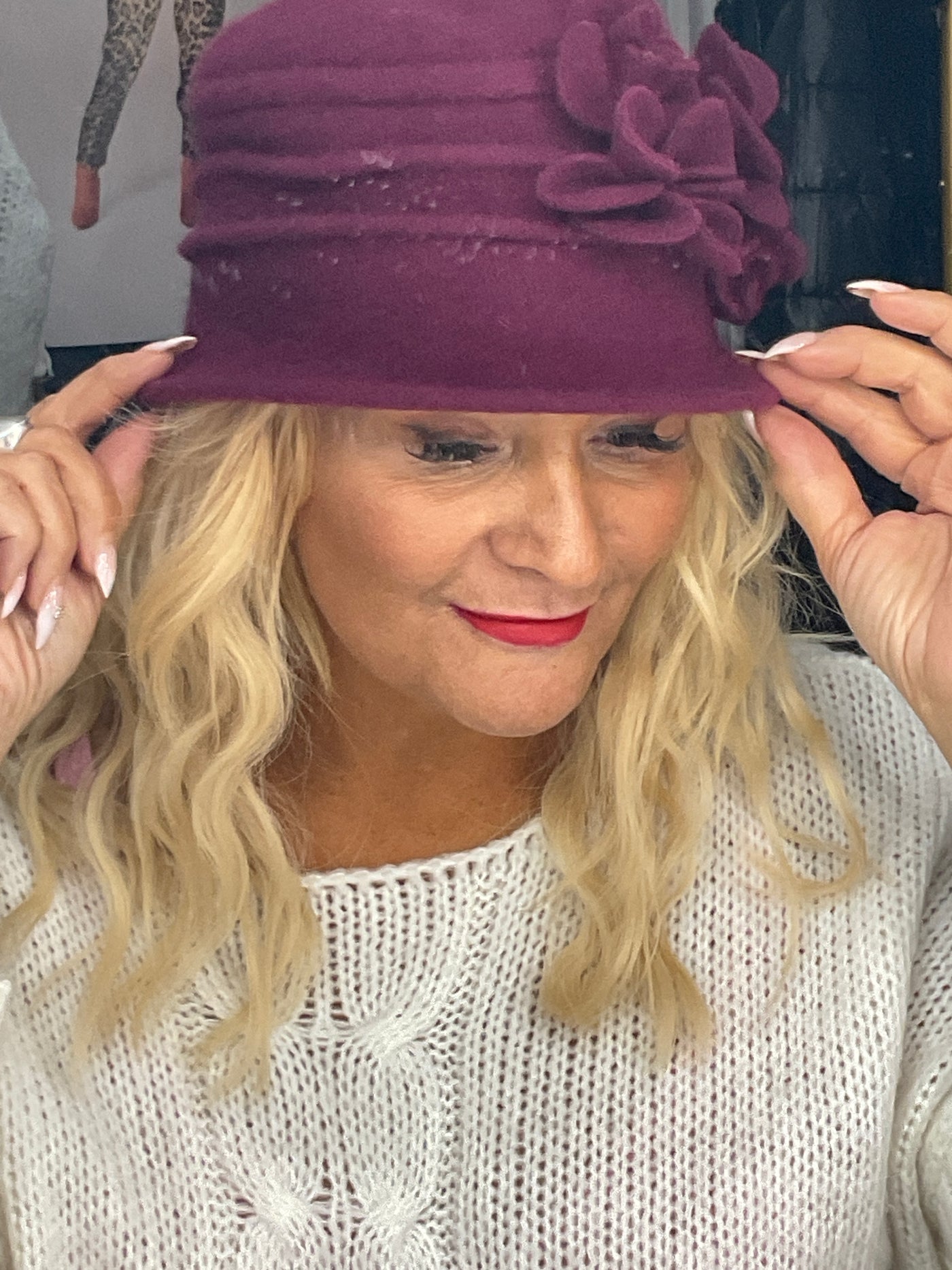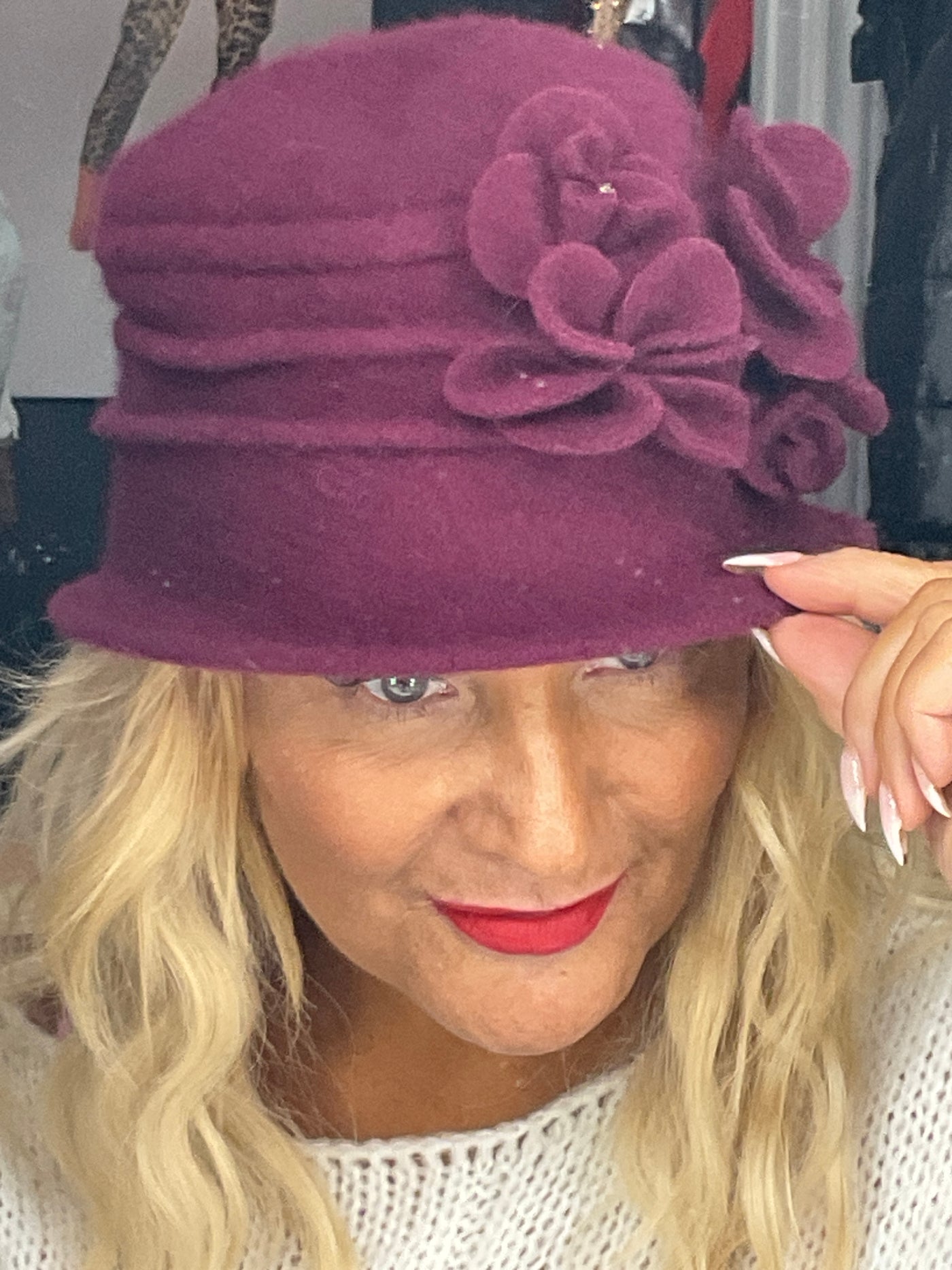 Ah25,435 Chapeau bordeaux avec fleurs 100% laine