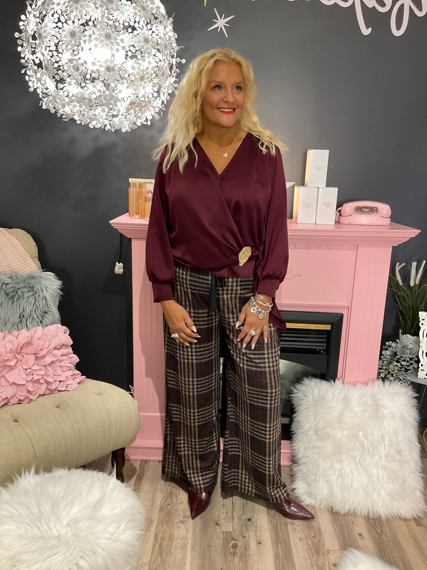 Haut bordeaux satiné avec broche doré,taille unique,