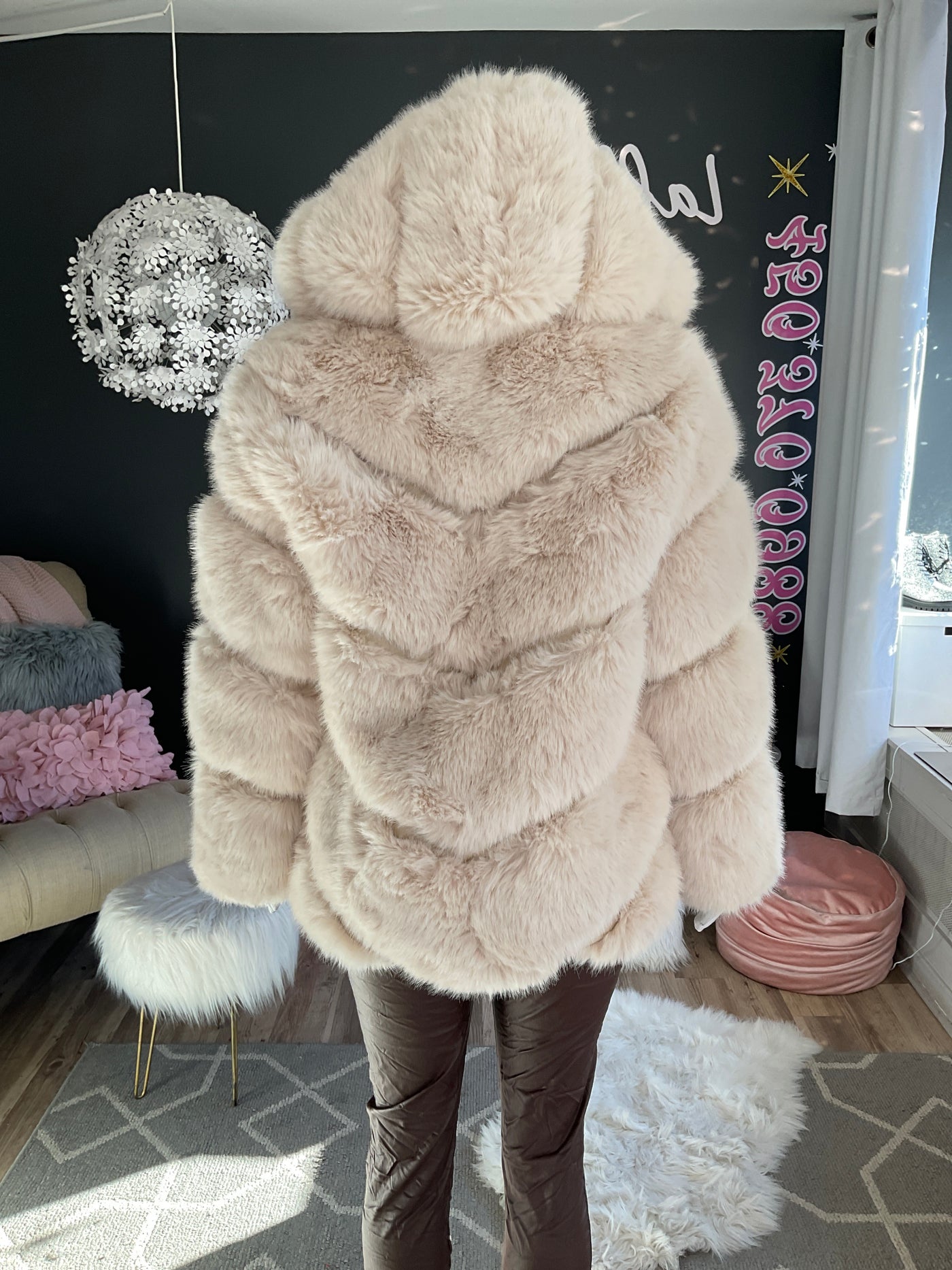 Ah25,301nov Manteau beige en fourrure synthétique avec capuchon et bande de cuir