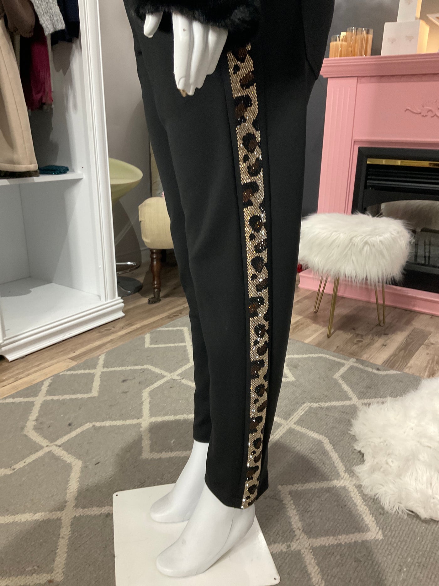 Ah25,101nov Pantalon noir avec bandes de léopards chaque côté coupe décontracté