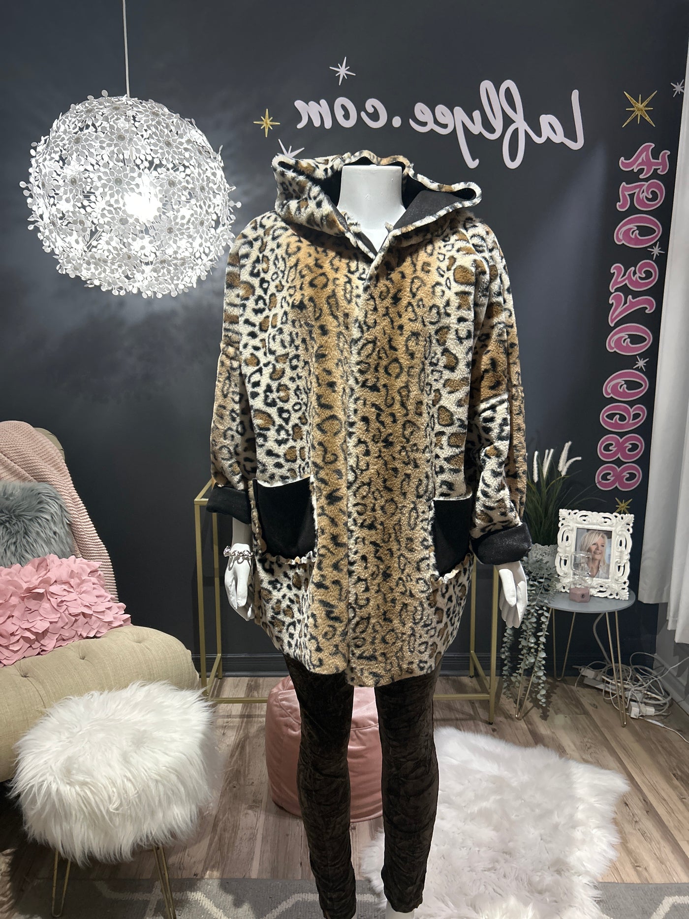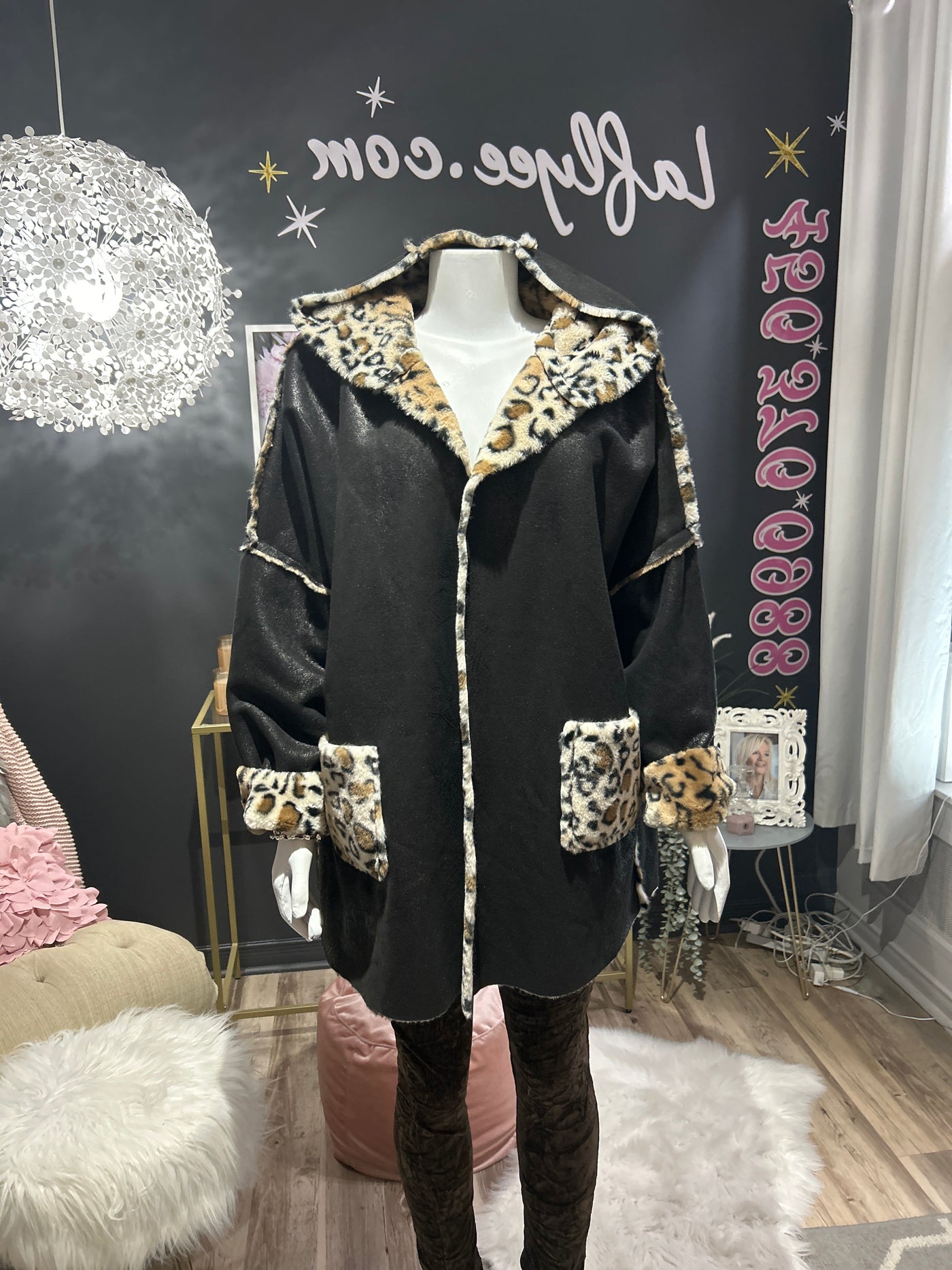 Manteau réversible noir et léopard en peluche court , taille unique,48 pouces de buste