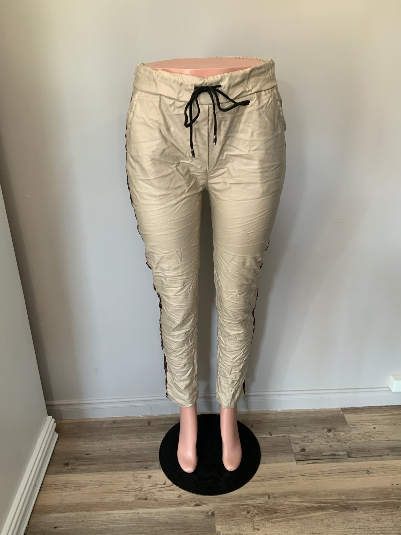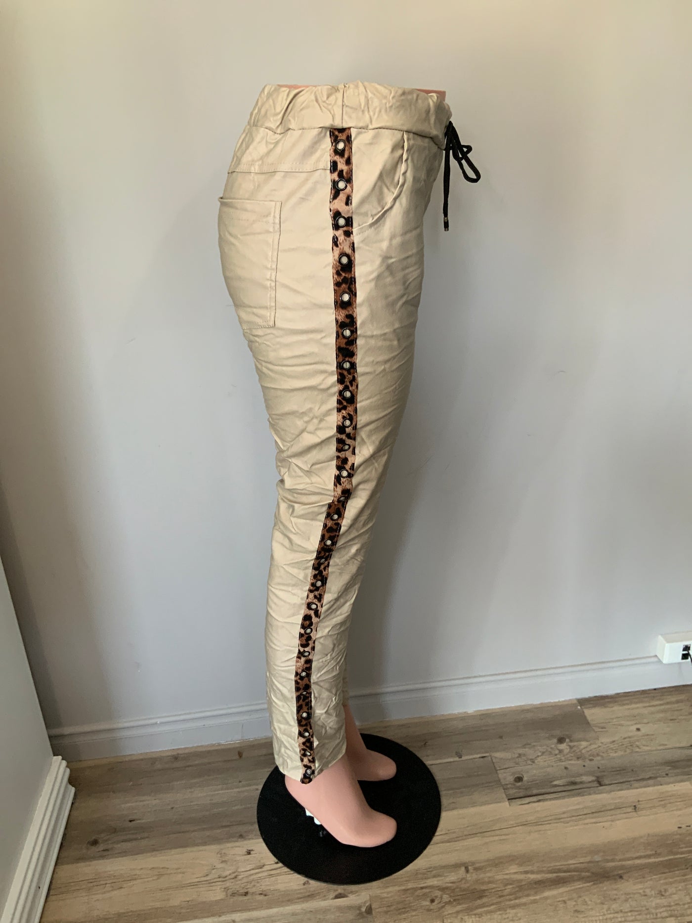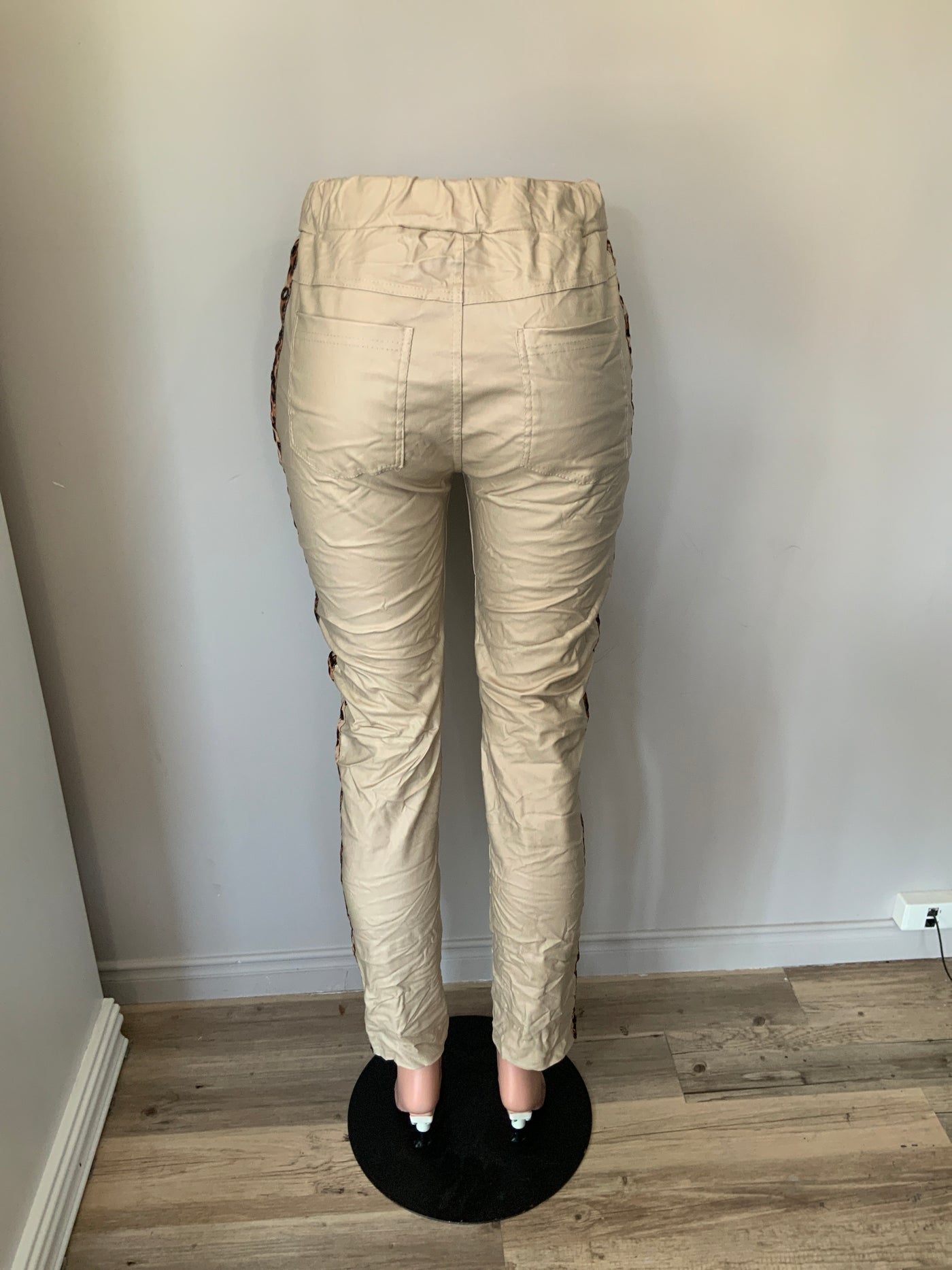 Pantalon crème avec bande de léopard sur les côtés avec cuir synthétique,taille unique