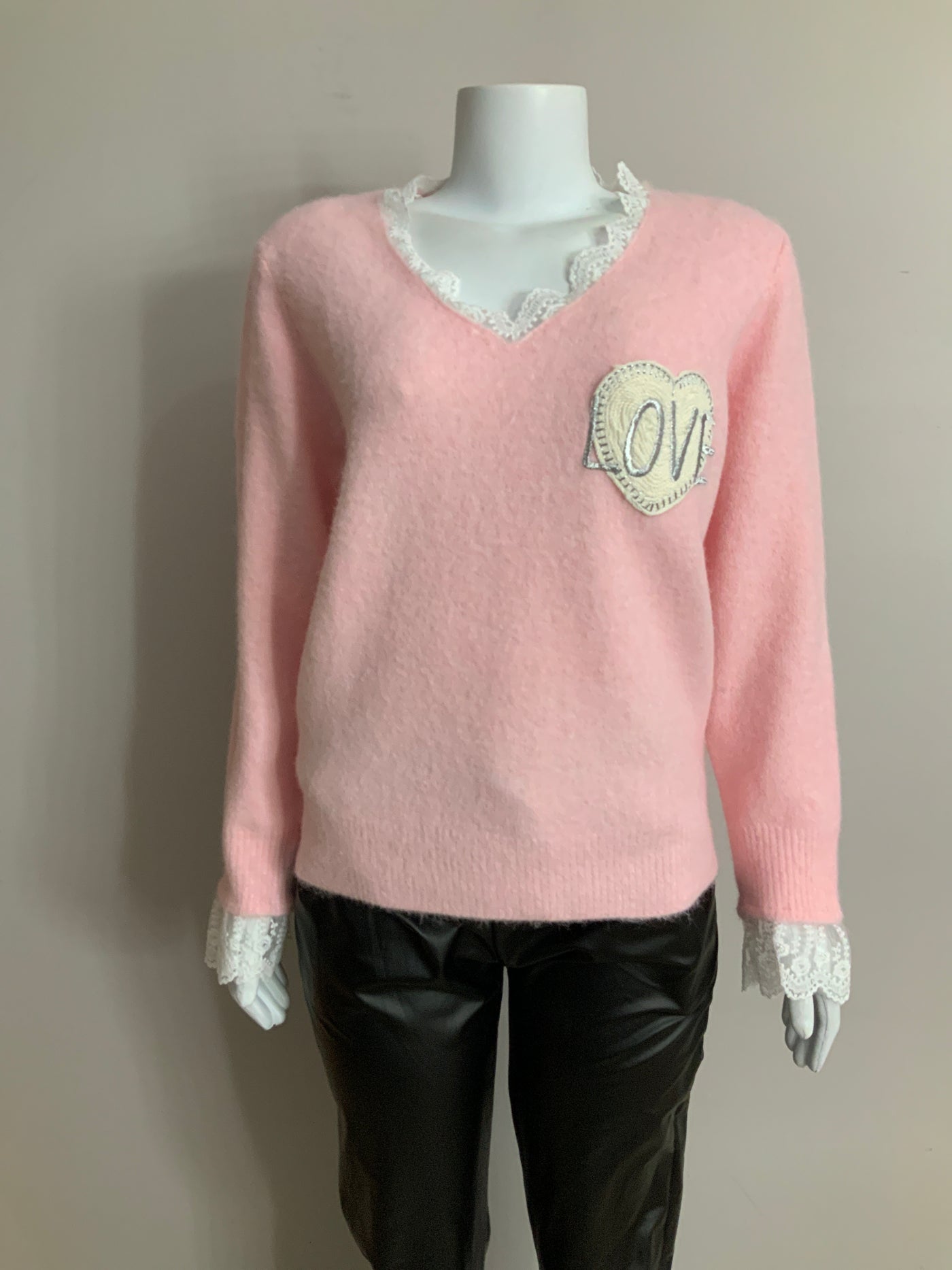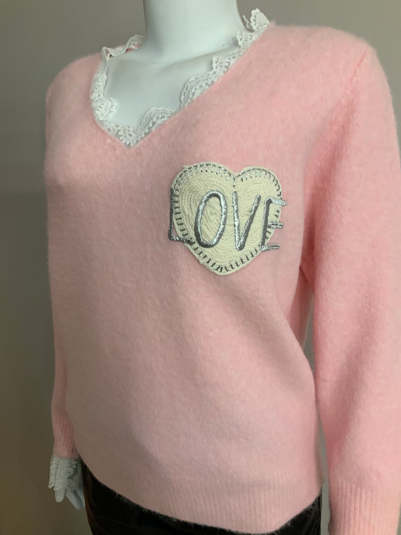 Pe26,12janv Haut rose avec coeur love et dentelle au cou et au bas des manches ,taille unique et 44 pouces de buste