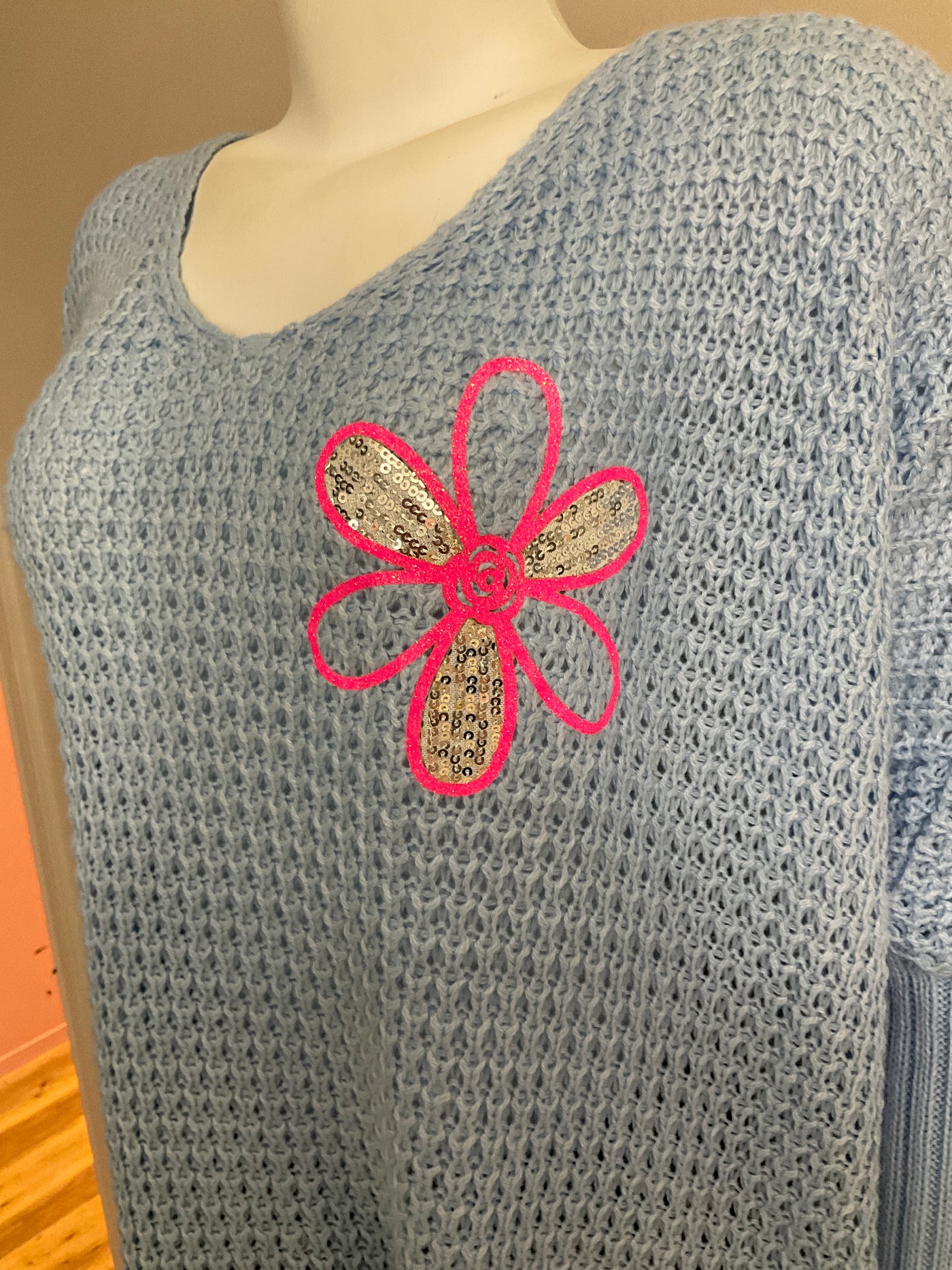 Pe26,18janv Haut bleu avec marguerite rose et paillettes taille oversize 72 pouces de buste