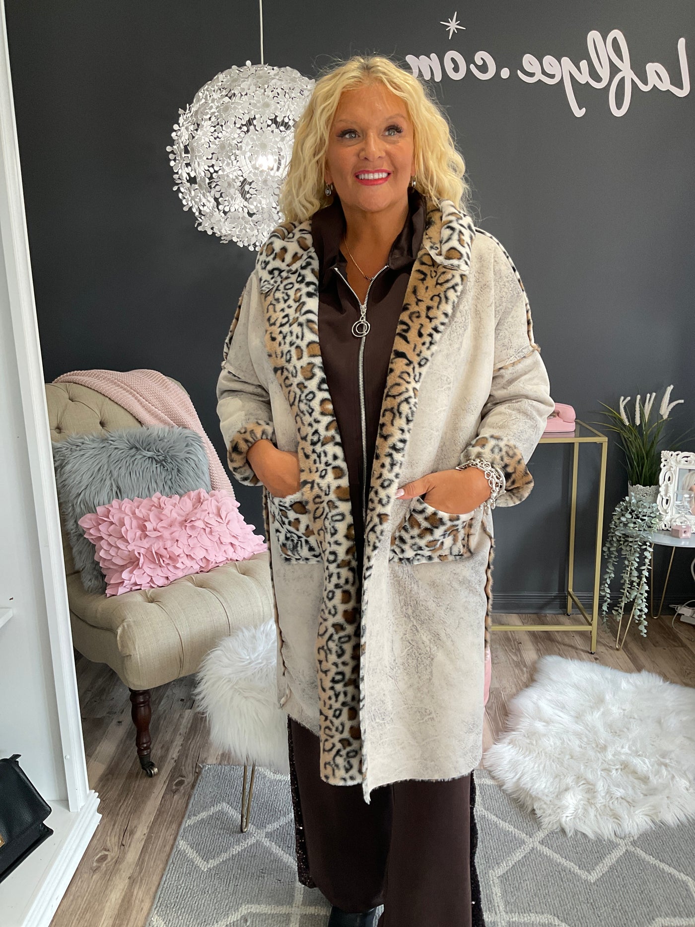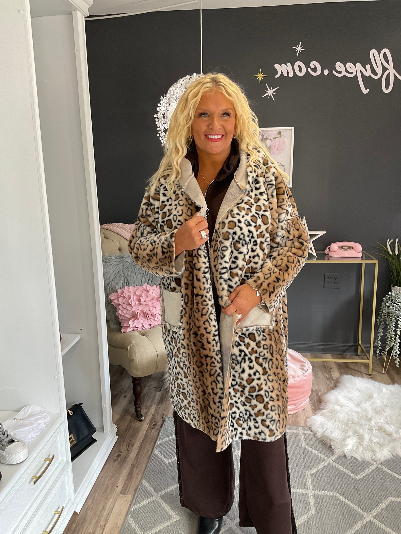 Manteau réversible grèges et léopard,en cuir synthétique et en peluches taille unique,58 pouces de buste