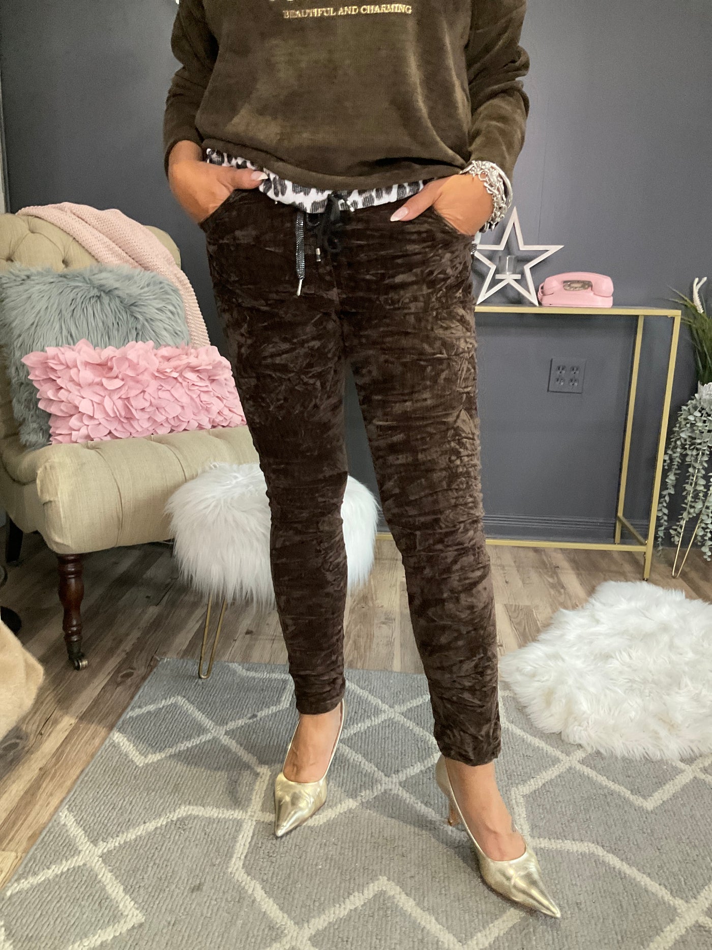Pantalon brun velours froissé ,taille unique qui habille jusqu’à 16 ans