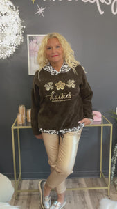 Haut brun avec trèfle léopard avec capuchon en velours côtelé et écriture,taille unique,50 pouces de buste