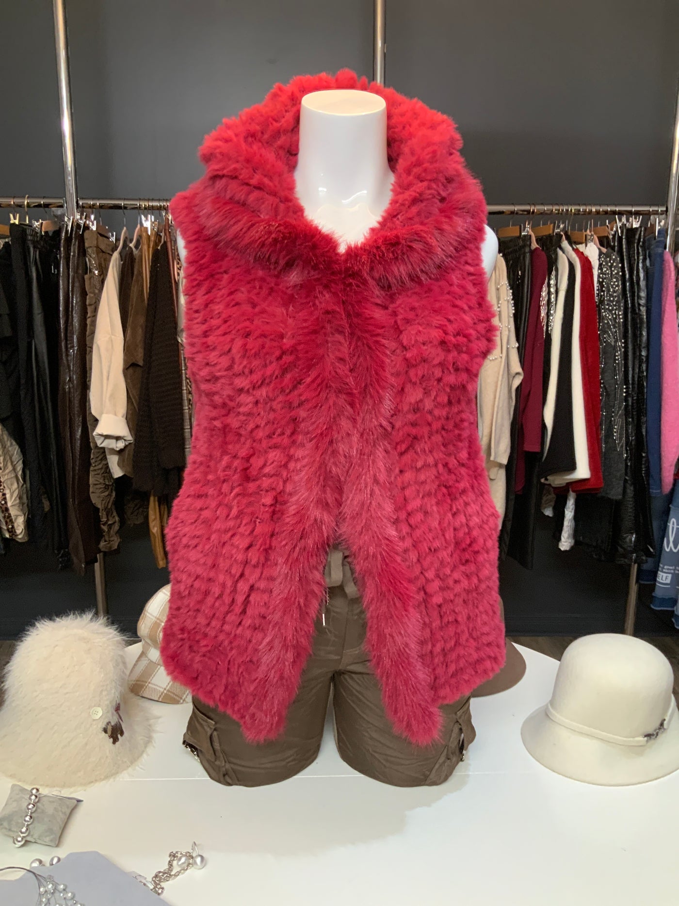 Veste ,doudoune,fourrure synthétique avec capuchon rose fushia,framboise en taille unique 47 pouces buste