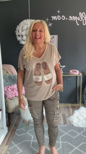 Haut beige foncé avec sandales et studs or doré et argent taille unique ,50 pouces de buste