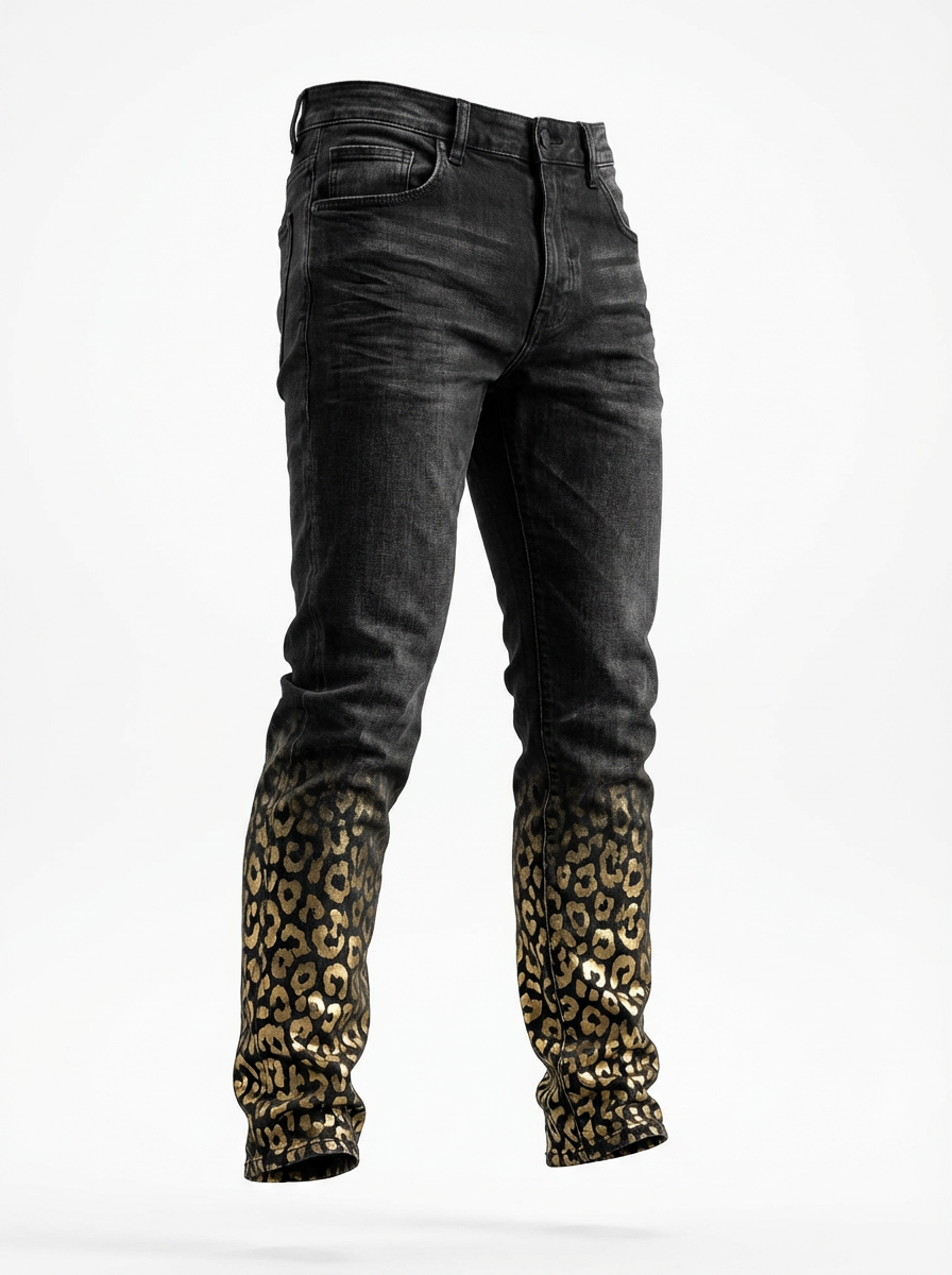 Pe26,101janv Jeans noir avec effet délavé et léopards doré