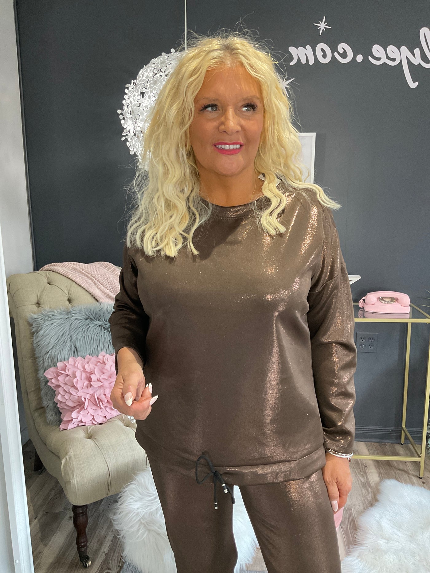 Haut lamé cuivré,avec cordon au bas taille unique ,50 pouces de buste