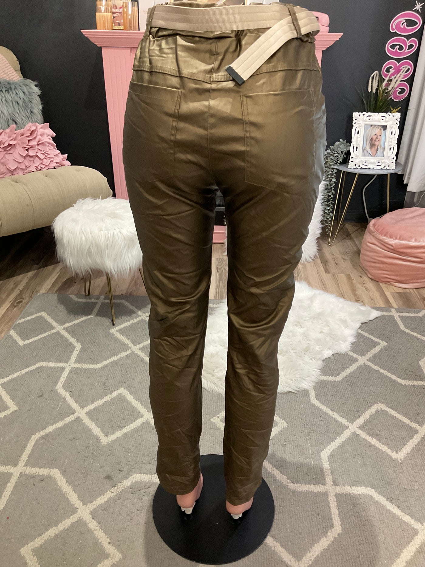 Ah25,111nov Pantalon bronze avec ceinture beige et en cuir synthétique
