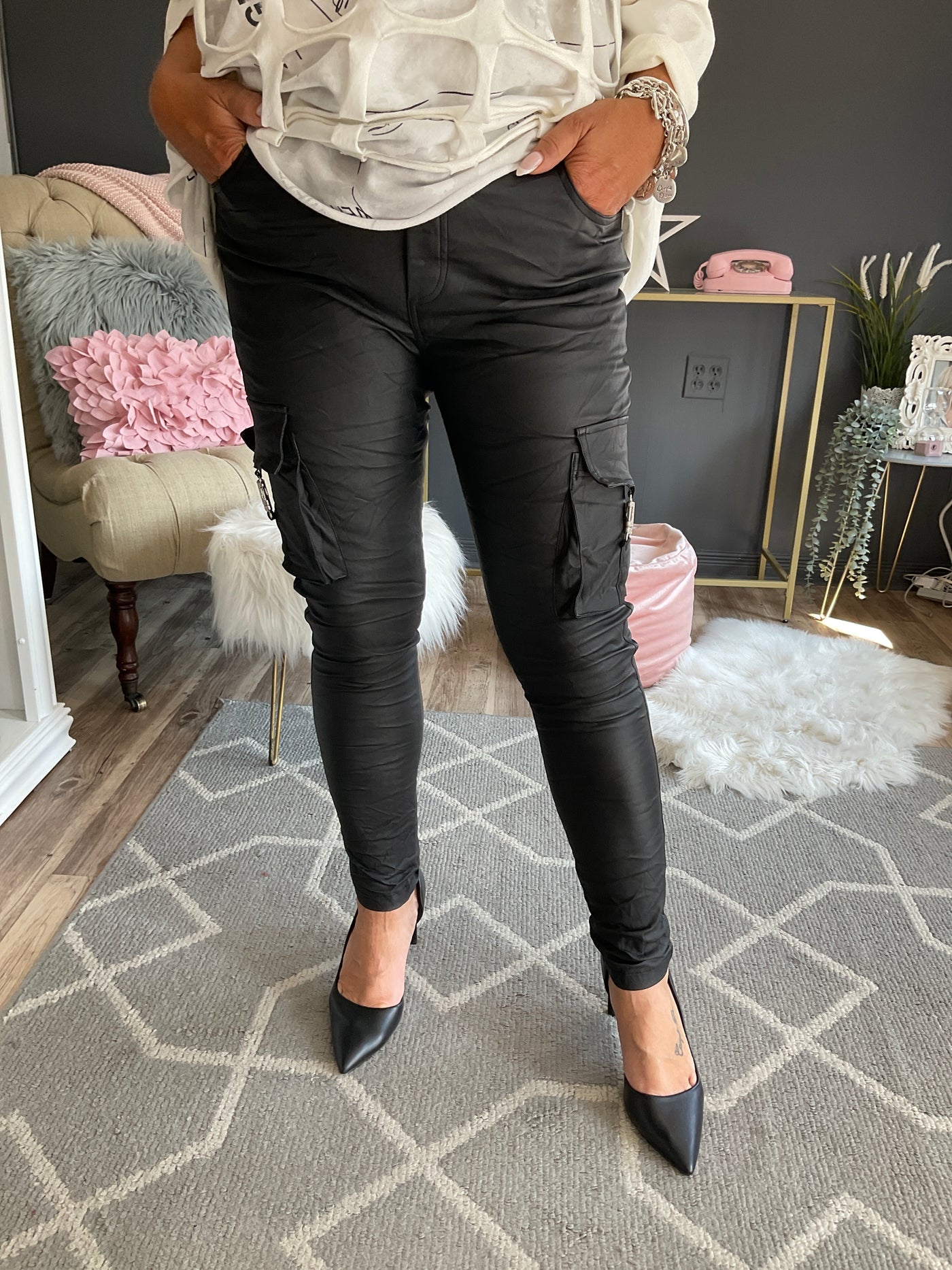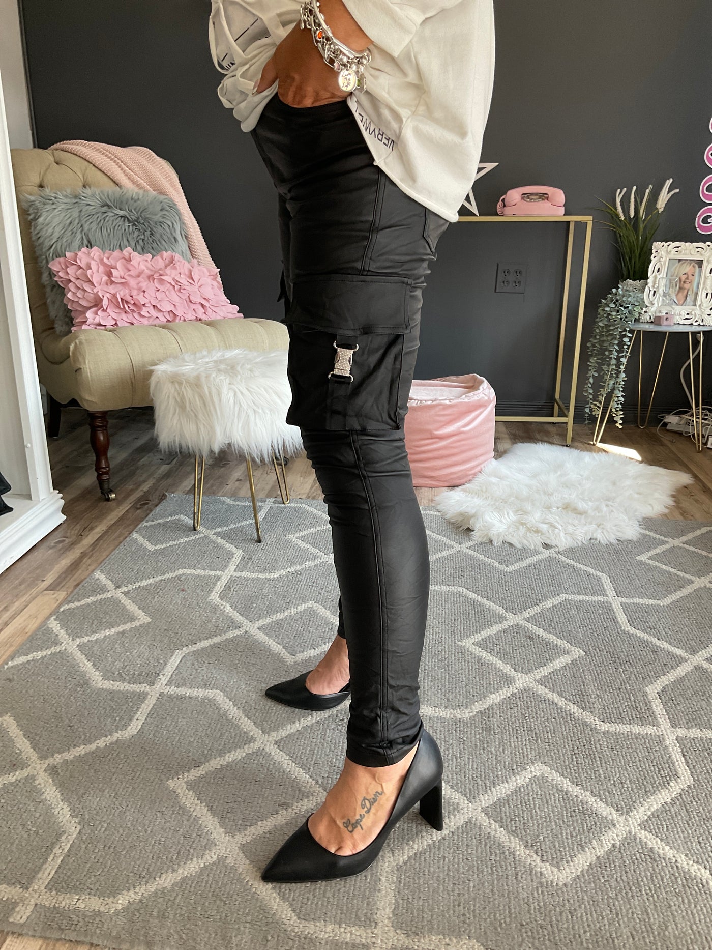 Pantalon cargo noir en cuir synthétique,taille unique