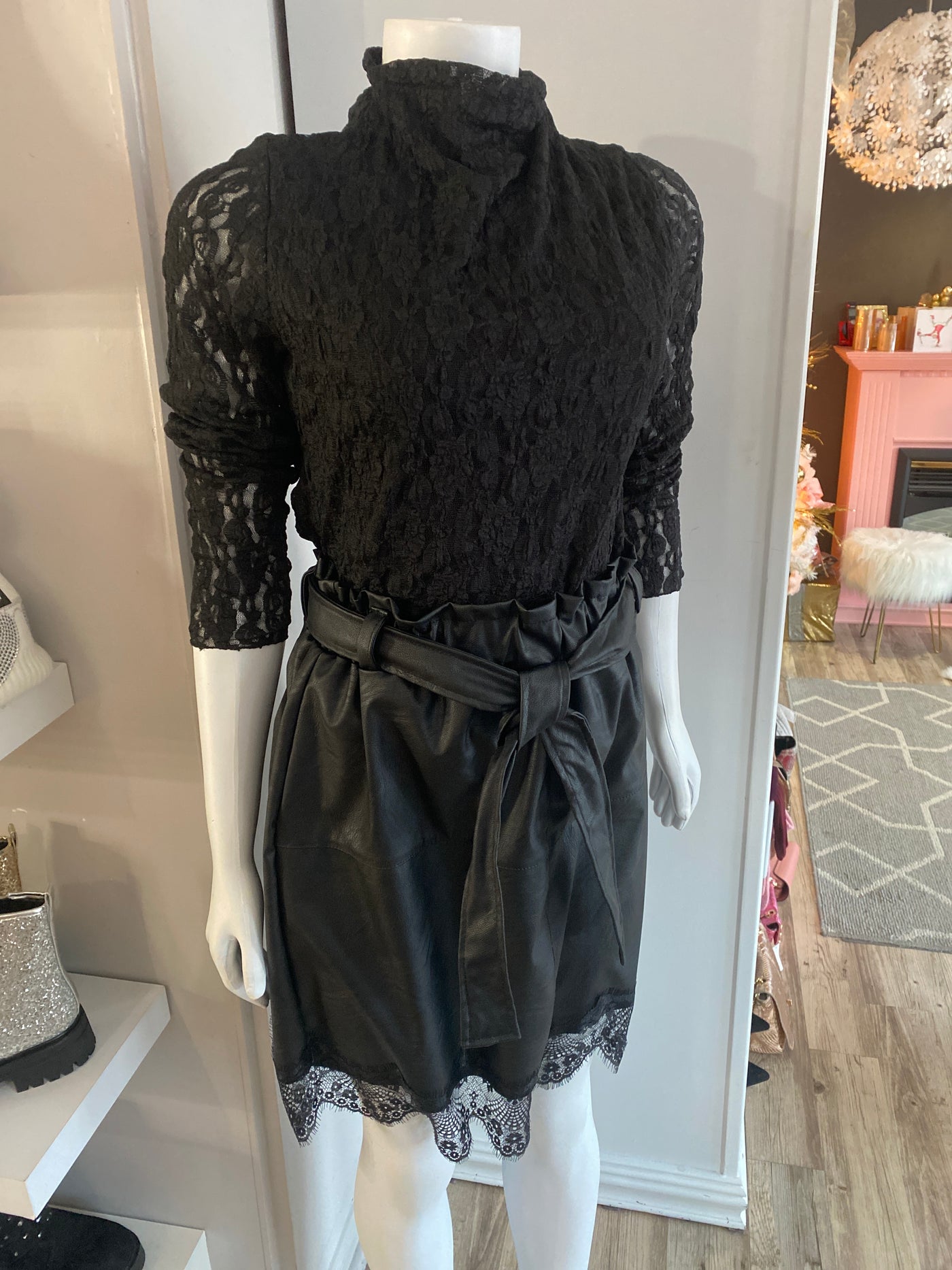 Ah25,129dec Jupe noire courte en cuir synthétique avec dentelle noir au bas et ceinture