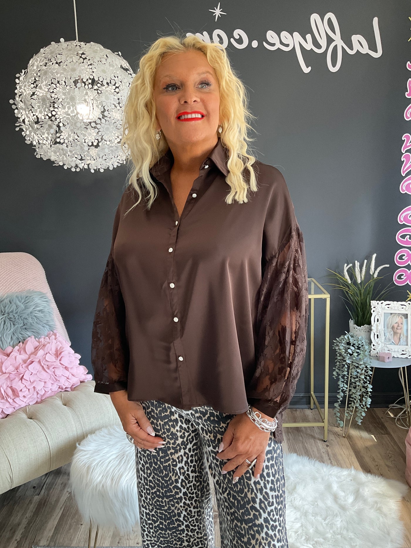Chemisier brun chaucolat avec dentelle bouton pierres taille unique,50 pouces de buste
