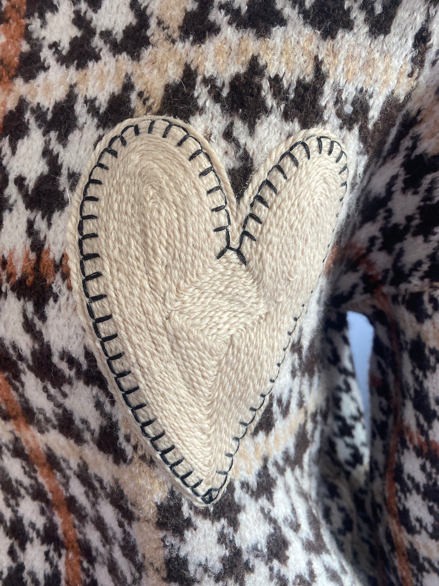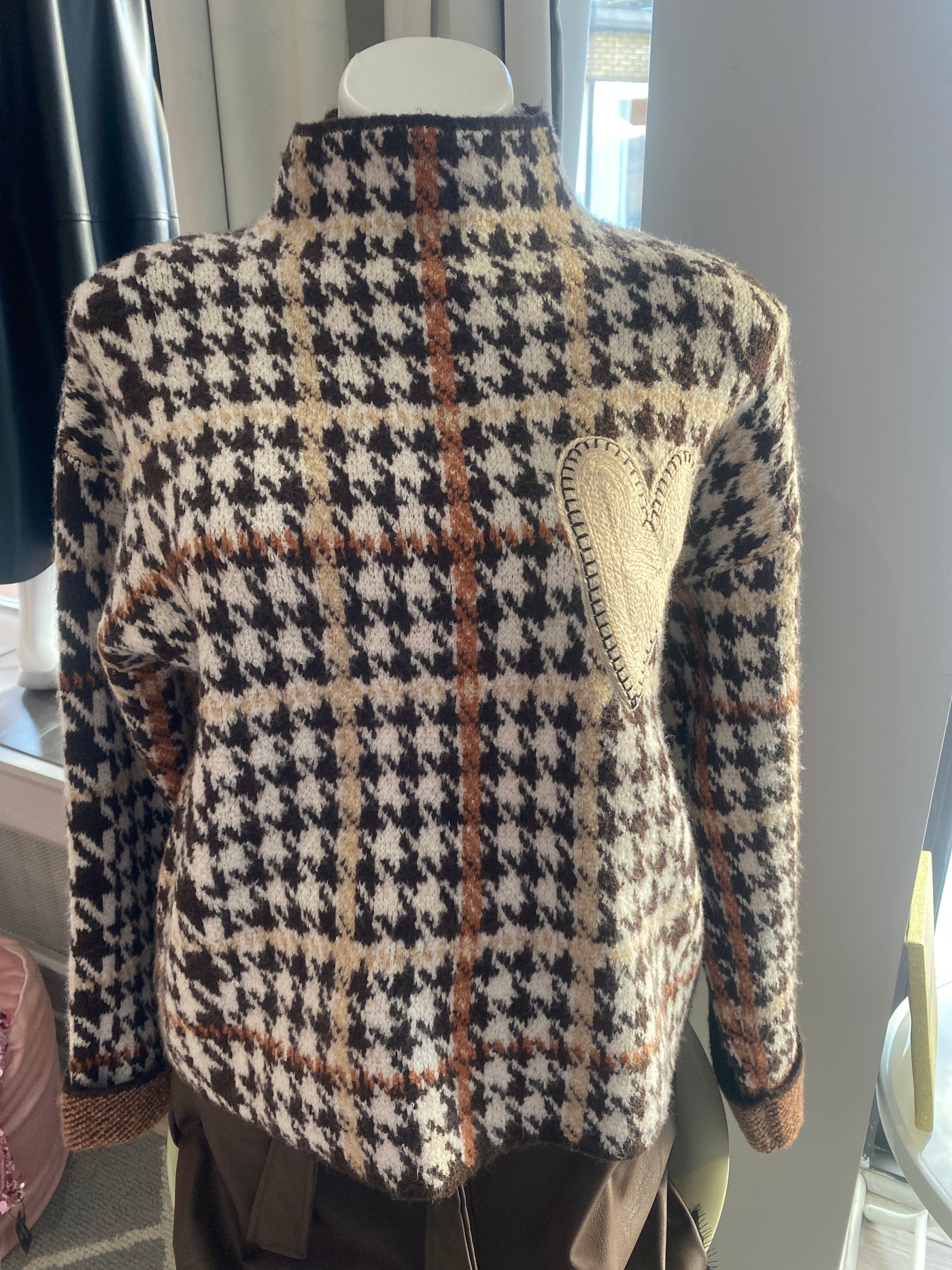 Chandail en tricot pied de coq couleurs terre, brun, beige, camel