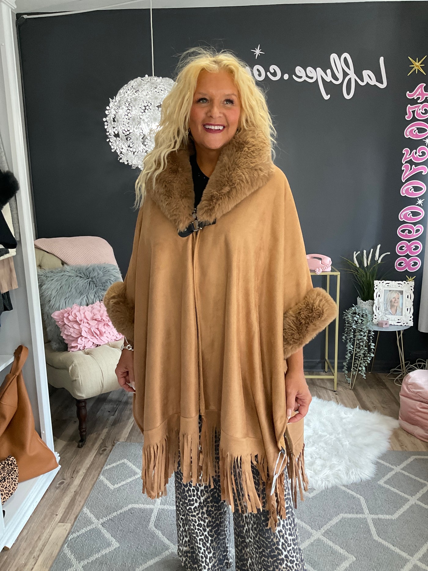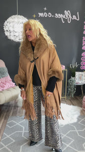 Cape camel avec franches suédine et fourrure synthétique,taille universelle