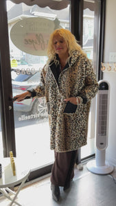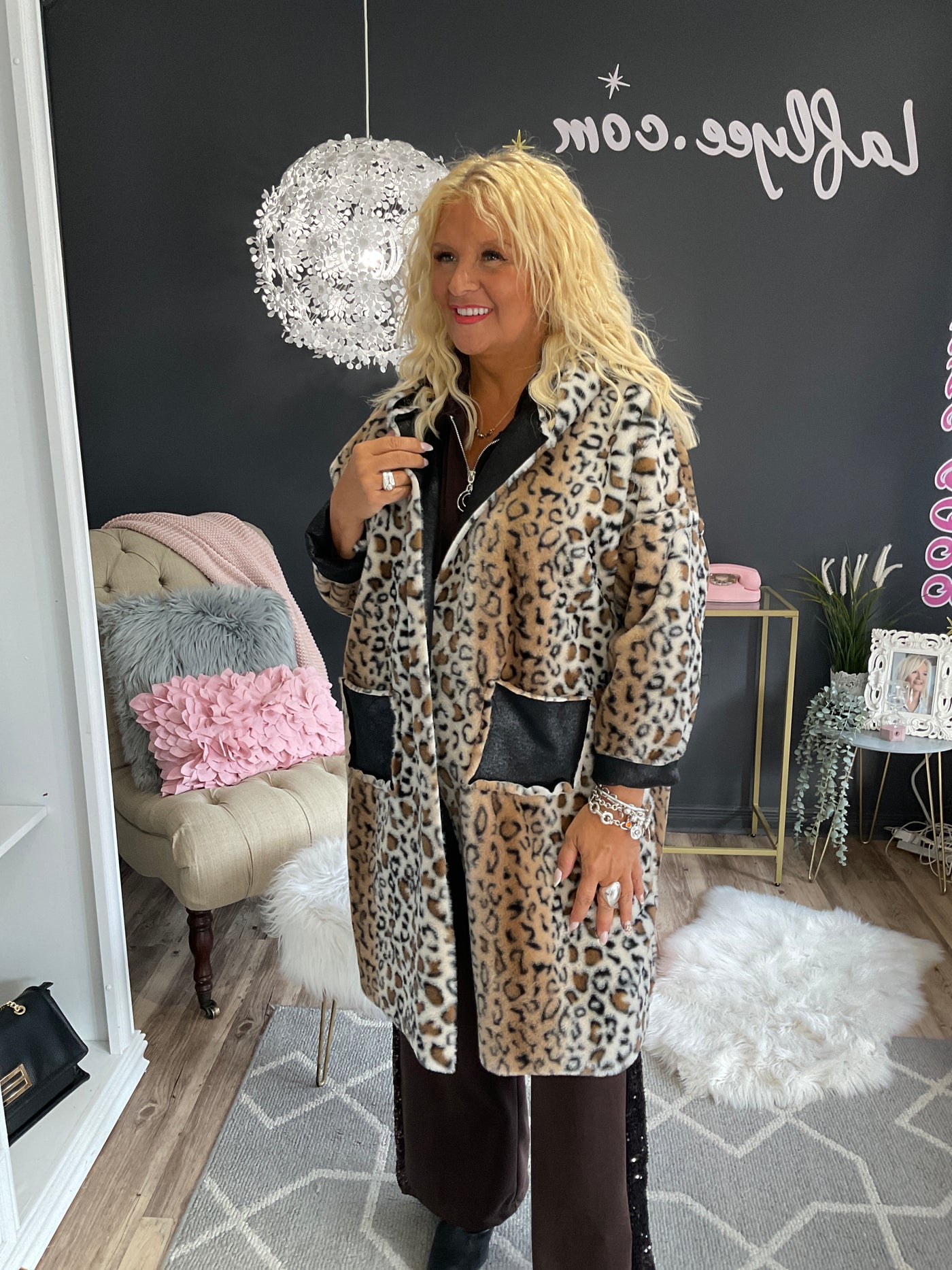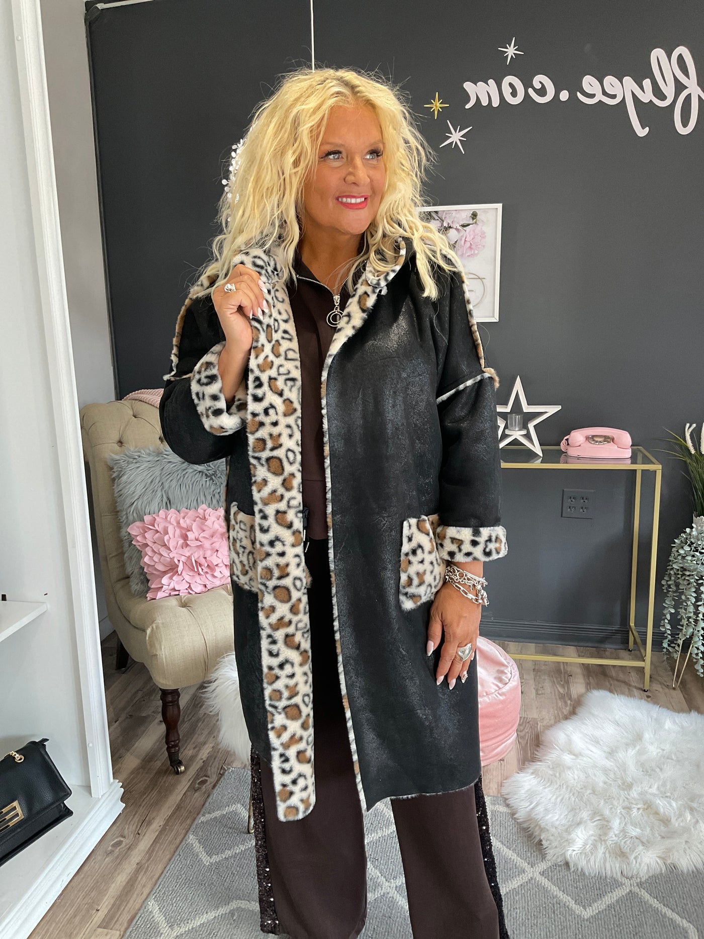 Manteau noir et léopard en cuir synthétique,et en peluches,58 pouces de buste