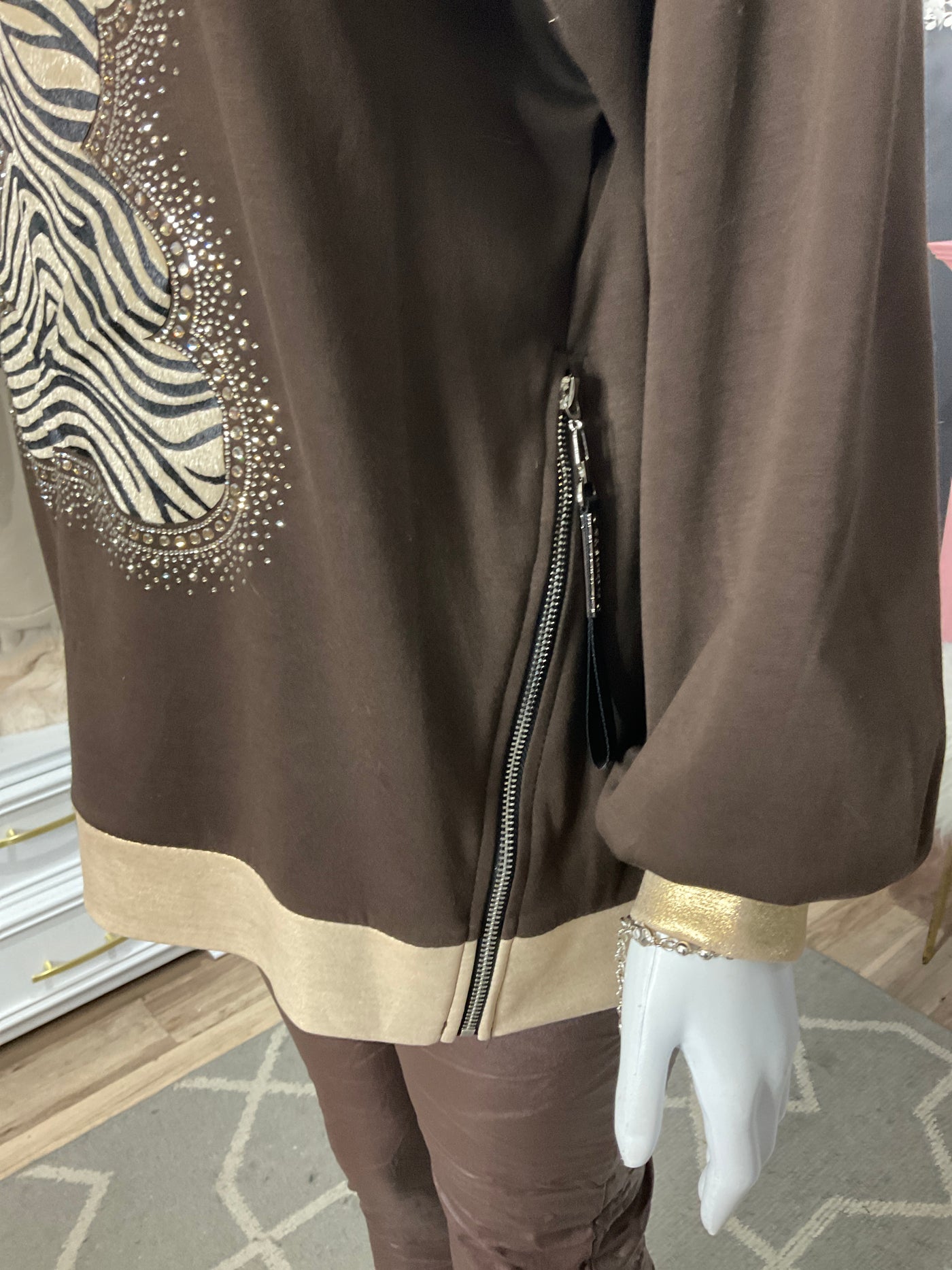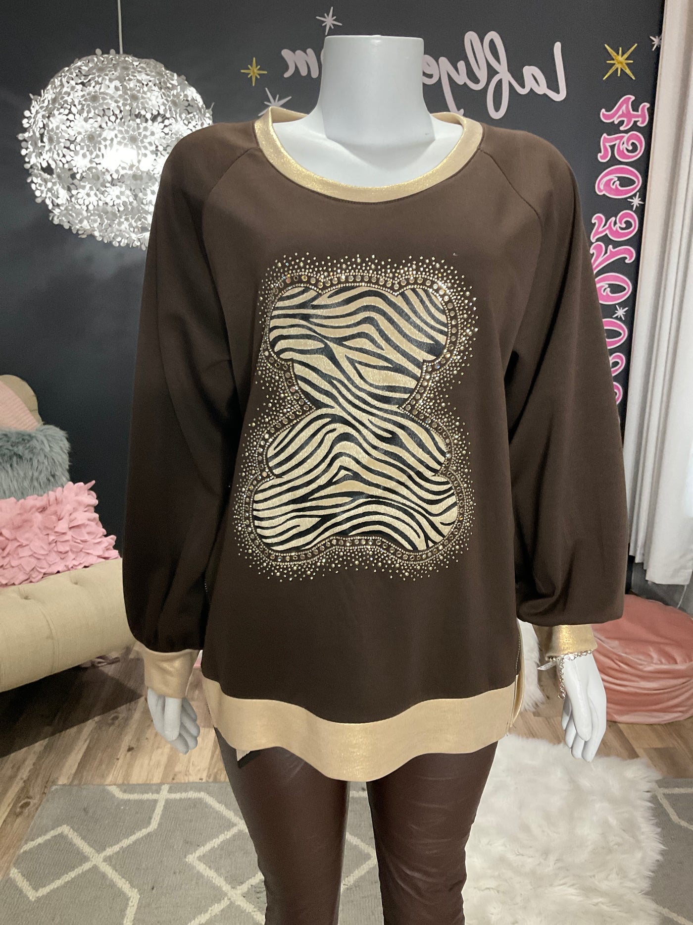 Ah25,4nov Haut brun avec ourson devant zèbré avec pierres et fausse fermeture éclair