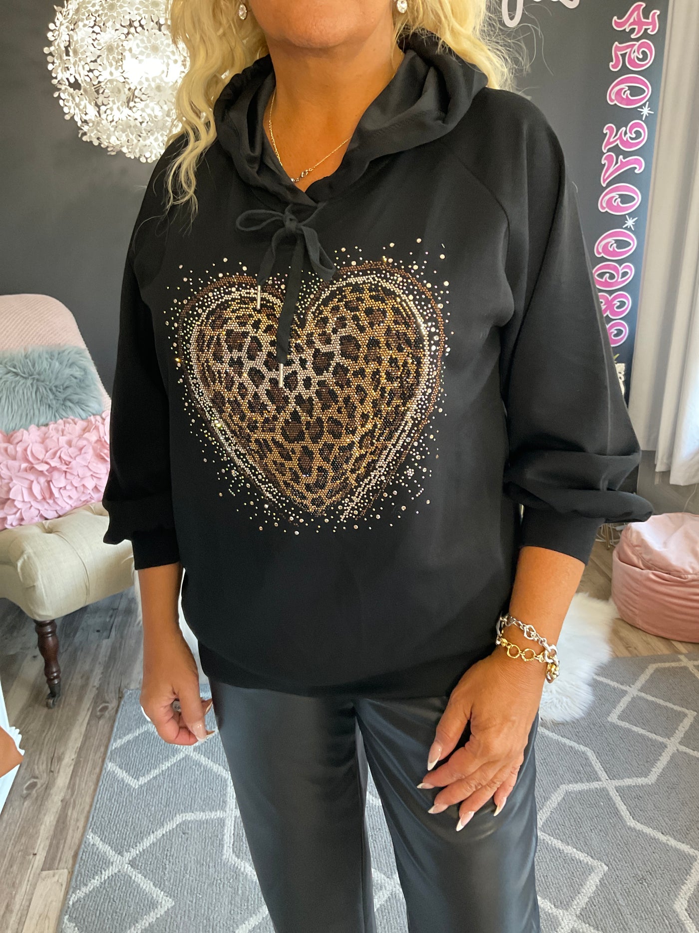 Hoodie noir avec cœur avec paillettes,taille unique ,48 pouces de buste