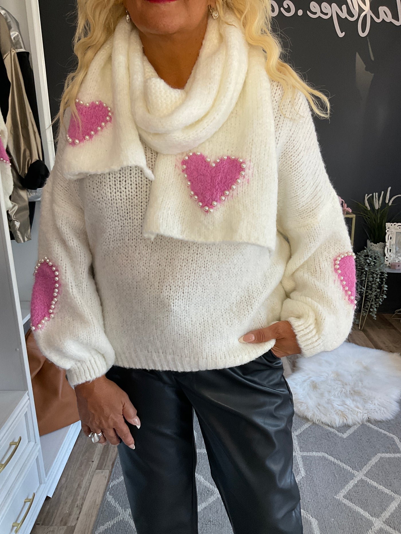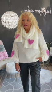 Haut blanc cassé avec cœur rose avec 9 % de laine ,taille unique,56 pouces de buste