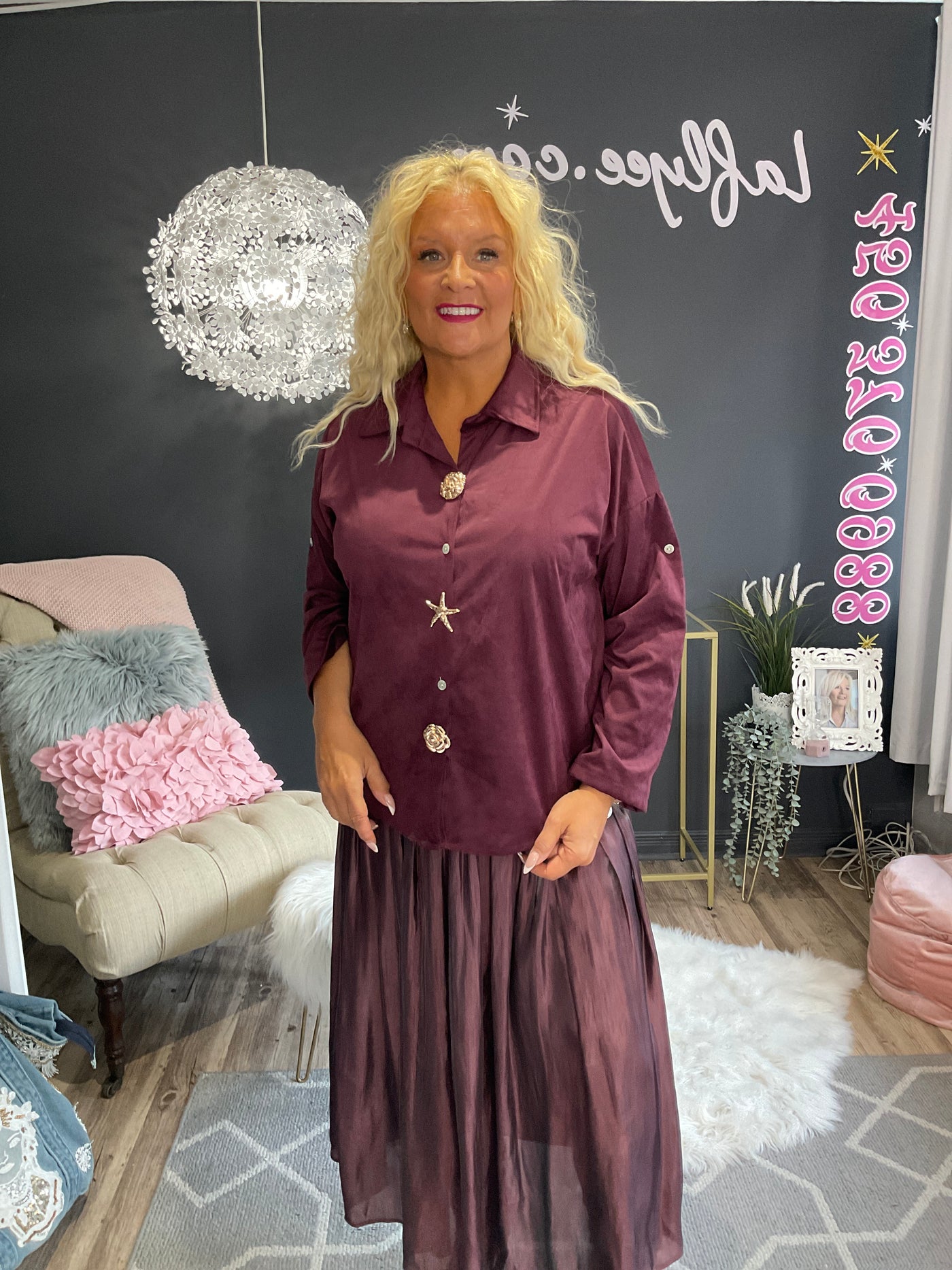 Chemisier bordeaux avec boutons doré,taille unique,48 pouces de buste